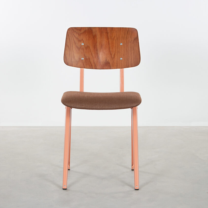 Op veler verzoek heeft De Machinekamer een meer aangeklede versie van de S16 ontwikkeld; de S16-stoel met gestoffeerde zitting en rug. Je kunt kiezen uit een volledig (rug en zitting) of deels (zitting) bekleedde stoel. Met een vulling van 2 cm dikte, is zitcomfort gegarandeerd. Het maakt de stoel bovendien geschikt voor hogere tafels. De stofkleuren hebben wij met zorg uitgezocht, passend bij de kleuren van de frames. De bekleding geeft de stoel net wat meer cachet. Ook is het mogelijk zelf een stof uit te zoeken in de winkel in Zaandam & Utrecht. Voor ieder wat wils!