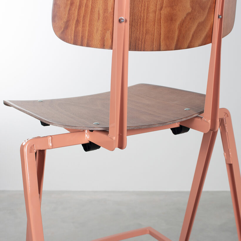 Frame gemaakt van gevouwen plaatstaal. Zit en rugleuning gemaakt van kunsthars plywood hout.