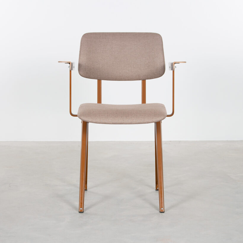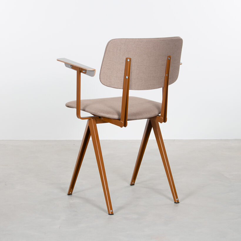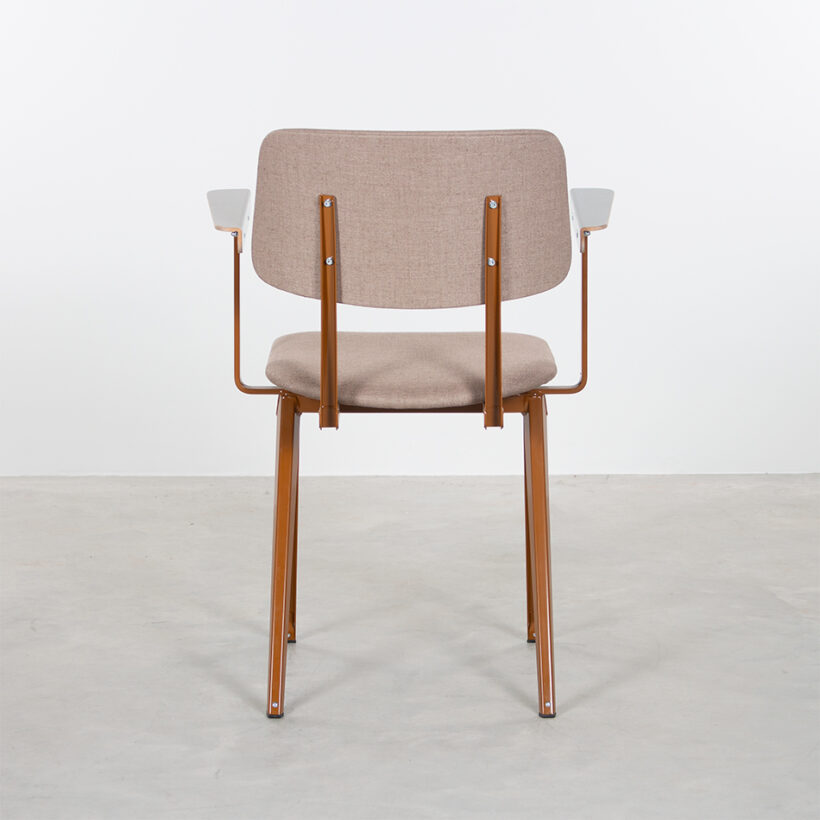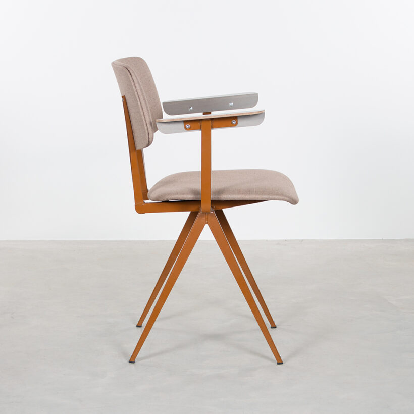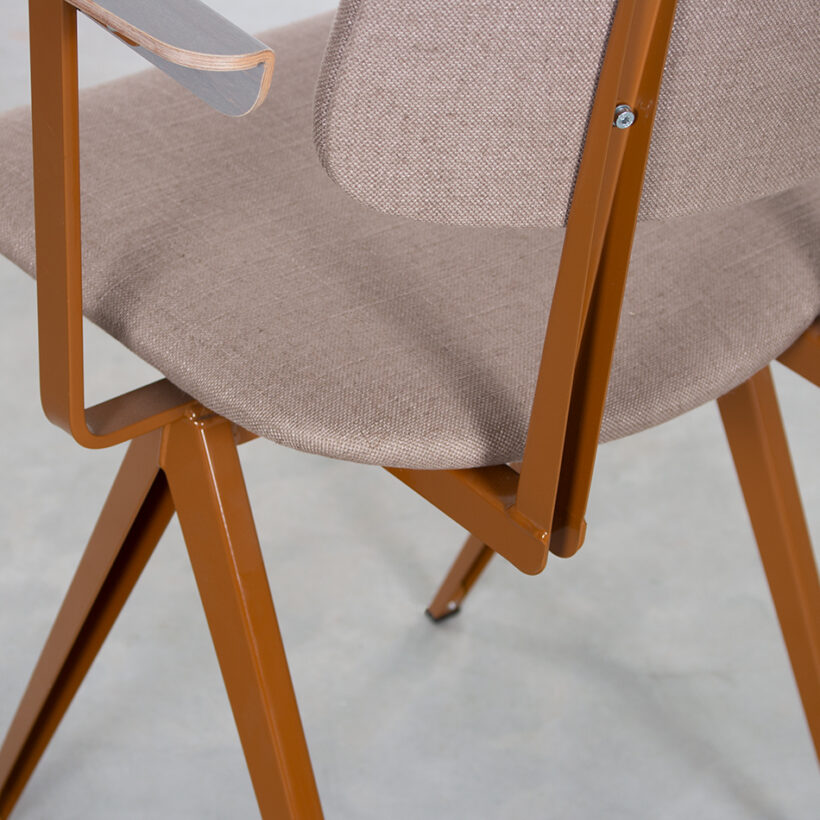 Op veler verzoek hebben we ook een meer aangeklede versie van de S16 met arm ontwikkeld. U kunt kiezen uit een volledig (rug en zitting) of deels (zitting) bekleedde stoel. Met een vulling van 2 cm dikte, is zitcomfort gegarandeerd. Het maakt de stoel bovendien geschikt voor hogere tafels. De stofkleuren hebben wij met zorg uitgezocht, passend bij de kleuren van de frames. De bekleding geeft de stoel net wat meer cachet. Voor ieder wat wils.