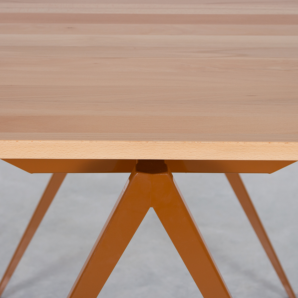 The TD4 Bistro is designed in the same way as the TD4 table. The frame is made of folded sheet steel, welded and finished with a powder coat. The folded sheet steel makes the table incredibly strong, without making the table very heavy. The characteristic passer-shaped legs give the TD4 Bistro an industrial look. Solid beech, oak, or walnut wood is used for the tabletop, softly finished in oil or varnish. This gives the wood a light appearance. The attractive colour palette gives the bistro a modern touch.