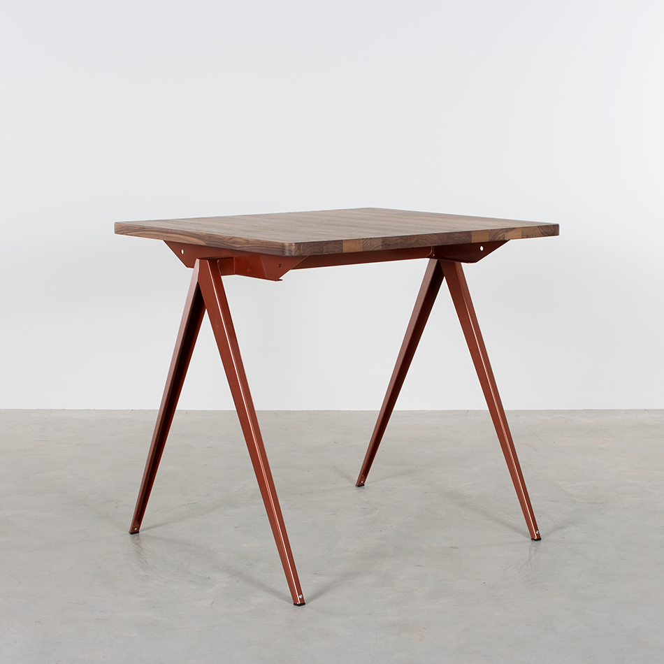The TD4 Bistro is designed in the same way as the TD4 table. The frame is made of folded sheet steel, welded and finished with a powder coat. The folded sheet steel makes the table incredibly strong, without making the table very heavy. The characteristic passer-shaped legs give the TD4 Bistro an industrial look. Solid beech, oak, or walnut wood is used for the tabletop, softly finished in oil or varnish. This gives the wood a light appearance. The attractive colour palette gives the bistro a modern touch.
